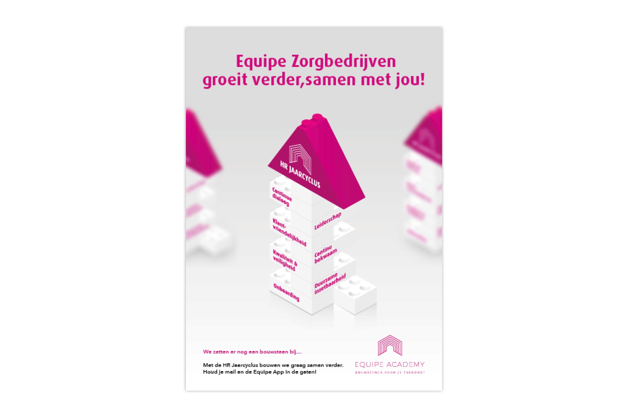 Hiervoor creëerden we in de eerste plaats een visual device dat letterlijk is opgebouwd uit de zeven Equipe-bouwstenen; een ‘blokkentoren’ met een driehoekig blokje bovenop, die als zodanig een opvallende pijl naar boven vormt. Naast dit universele symbool voor groei/ambitie portretteerden we steeds andere typen Equipe medewerkers. Elk met hun eigen persoonlijke ‘speerpunten’, maar met één universele boodschap: Bouw verder aan je persoonlijke ontwikkeling met de Equipe Academy. Of je nu ‘steengoed’ wilt worden in leiderschap, in klantvriendelijkheid of een ander persoonlijk speerpunt wilt ontwikkelen; Equipe spoort je aan om dit vooral te delen met je leidinggevende!