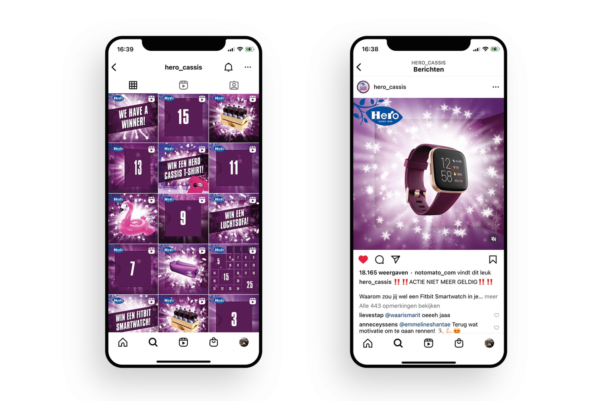 Bij uitstek in de donkere decembermaand is een frisse Insta-campagne met een adventskalender als themamechaniek. Uiteraard past deze mechaniek ook goed bij het funmerk Hero Cassis, met volop mogelijkheden om het merk goed en lekker uit te dragen.