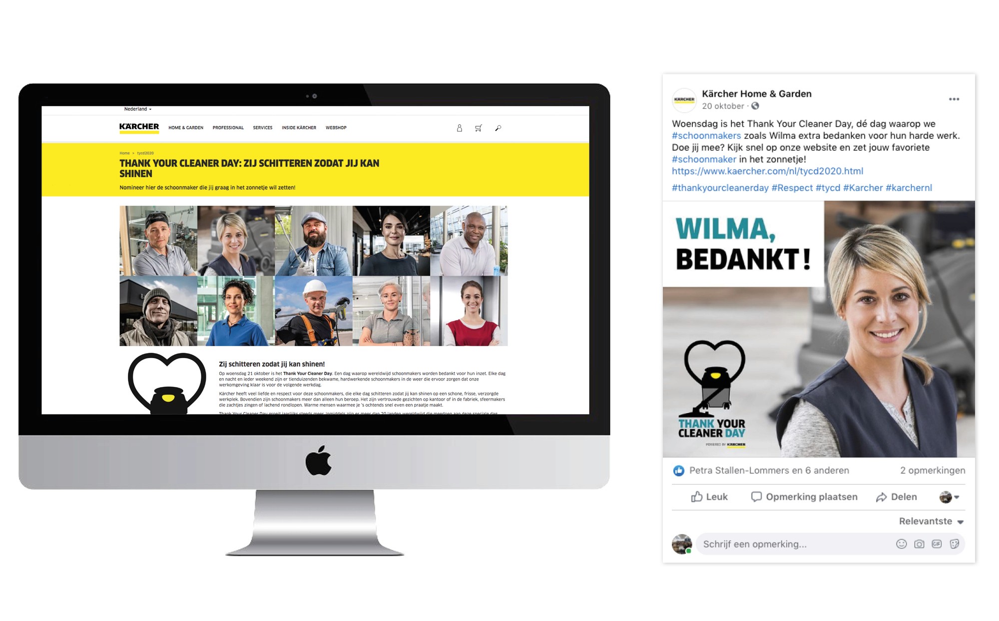 Een online competitie: nomineer jouw favoriete schoonmakeren misschien wint hij of zij een geweldige prijs! Door deze competitie te creëren, betrokken we werkgevers en werknemers en stimuleerden we ze om hun schoonmakers op elke mogelijke manier te bedanken. Want een persoonlijk bedankje namens hen is veel meer waard dan een bedankje namens Kärcher. Een thematische slogan: ‘Zij schitteren zodat jij kan stralen’