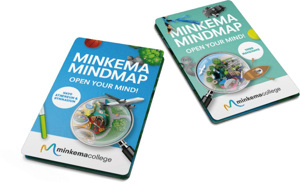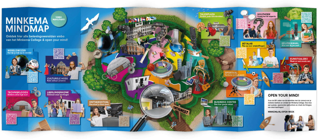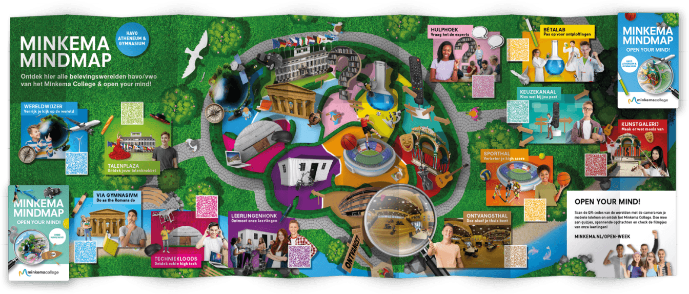 Net als de plattegrond van bijv. de Efteling, verwijst deze interactieve ‘Minkema MindMap’ naar allerlei fascinerende ‘werelden’ die (toekomstige) leerlingen kunnen gaan ontdekken. Al deze werelden geven alvast een voorproefje van wat ze straks van het Minkema mogen verwachten. Maar daar moeten de leerlingen zelf ook wat voor doen; zij gaan zélf op ontdekkingstocht, zij openen zelf hun toekomst en stellen zelf hun hersenen open voor nieuwe indrukken.