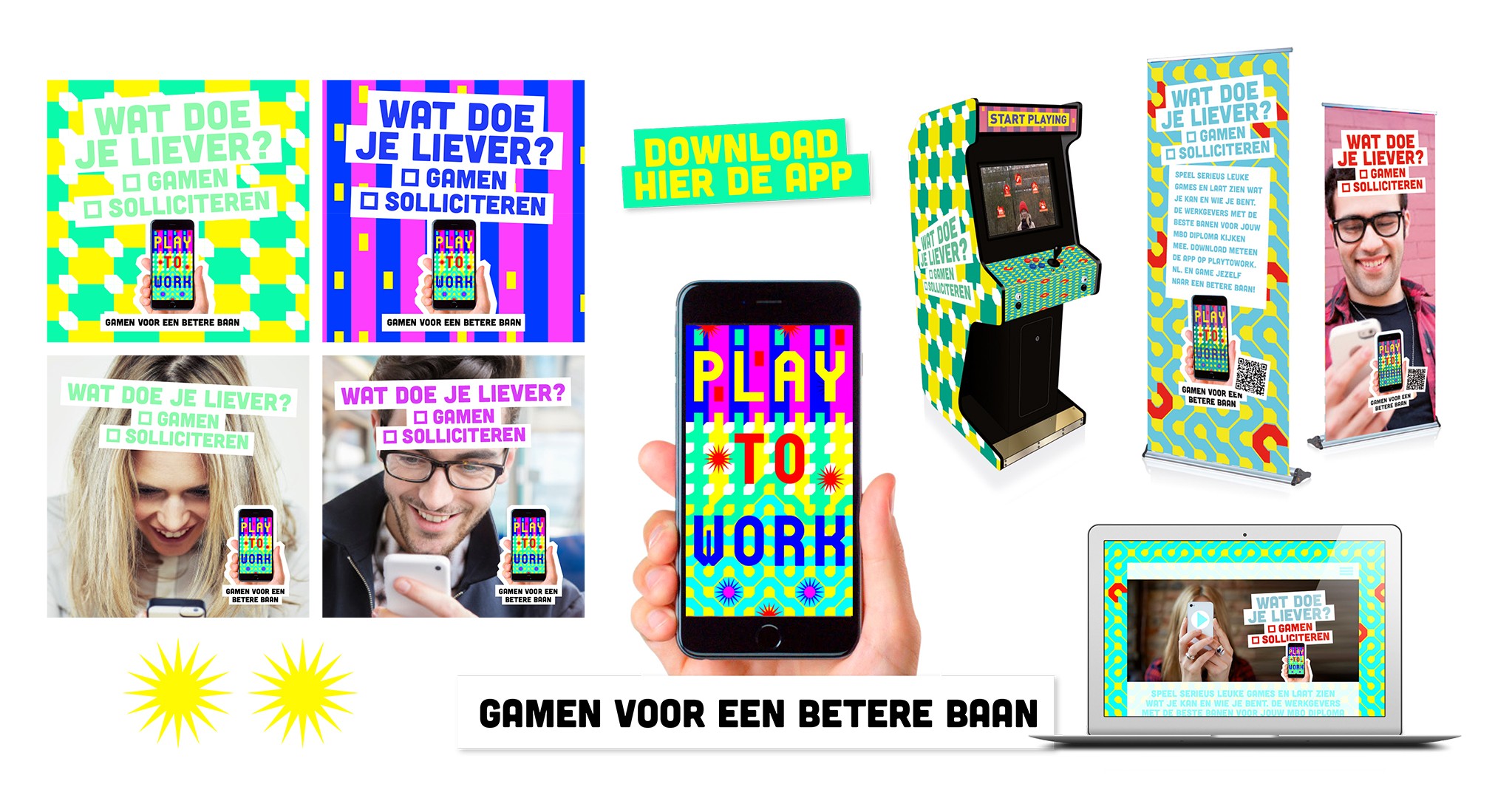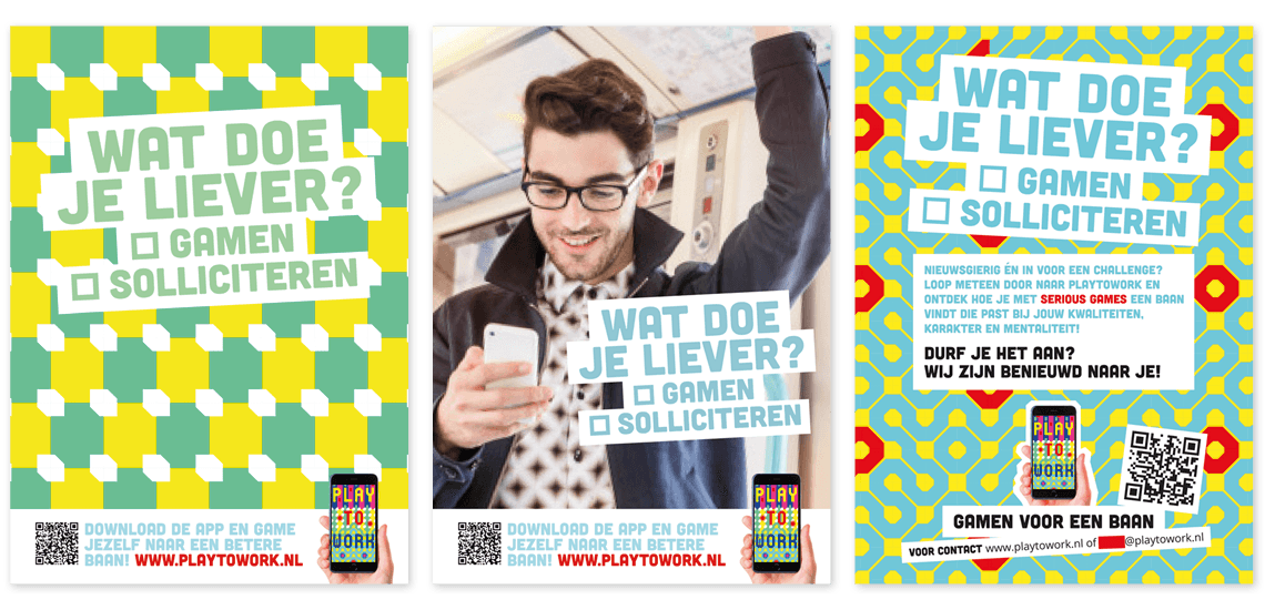 Om te voorkomen dat ieder jaar honderdduizenden mbo’ers tussen de wal en de werkgever blijven vallen, ontwikkelt PlaytoWork een gegamificeerd arbeidsbemiddelingsplatform. Een wat? Een app waar mbo’ers serious games spelen om inzicht te krijgen in wie ze zijn en wat ze kunnen. En zich daarmee in de kijker spelen bij de werkgevers die daarmee eindelijk een betaalbare manier hebben gevonden om de juiste mensen op de juiste plek te krijgen. Snapt u het nog? Wij wel. En met de social campagne die we ontwikkelden om de verschillende doelgroepen te laten zien dat gamen loont. Op PlaytoWork althans.